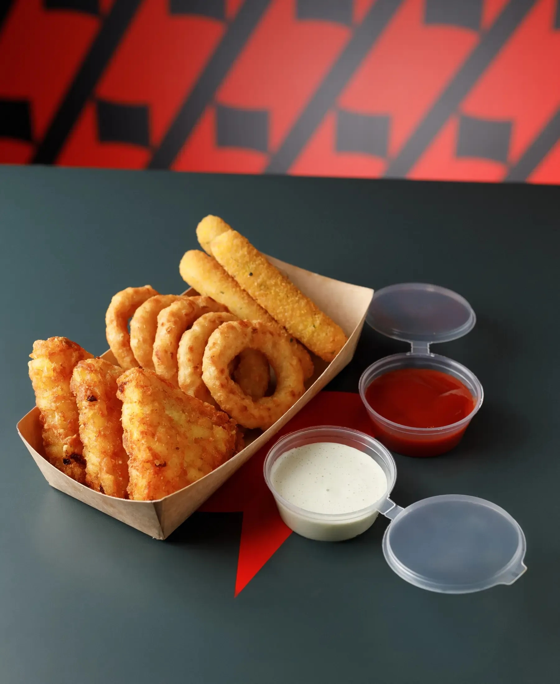 Mozzarela sticks 84g, Inele de ceapa 80g, Cartofi crocanti 150g, plus sos la alegere.